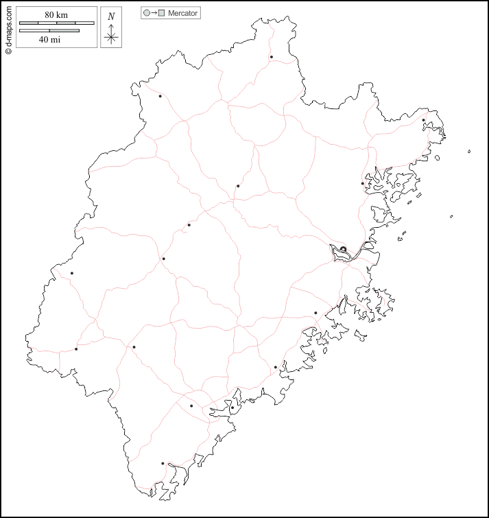 d-maps > एशिया > चीनी जनवादी गणराज्य > फ़ूज्यान > बाह्यरेखा, मुख्य शहरों, सड़कों, सफेद