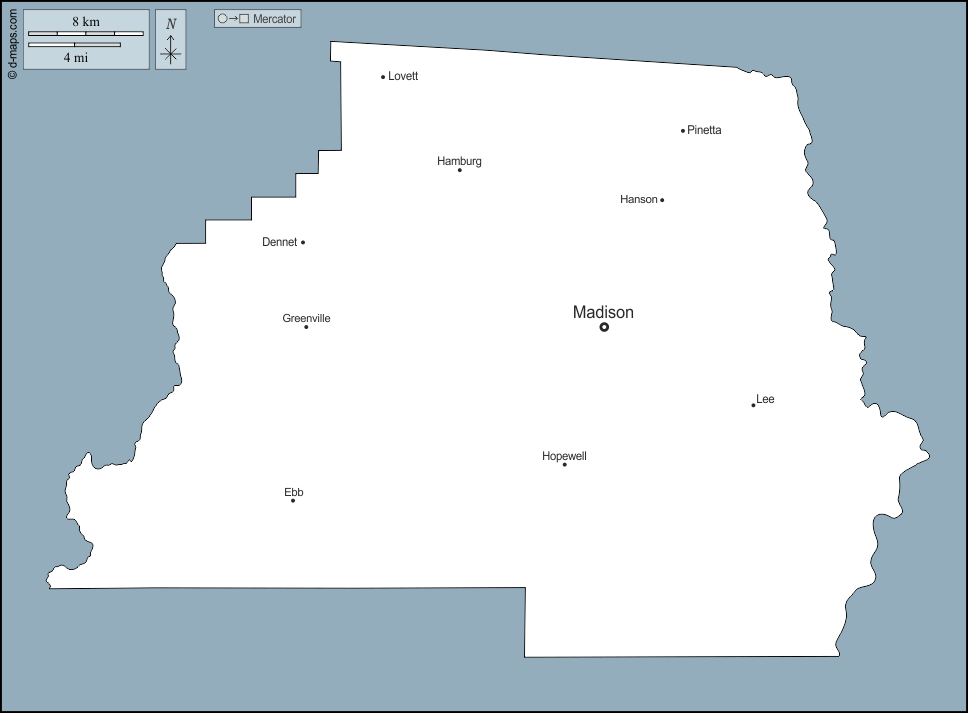 d-maps > संयुक्त राज्य > फ्लोरिडा > मैडिसन काउंटी > बाह्यरेखा, मुख्य शहरों, नाम
