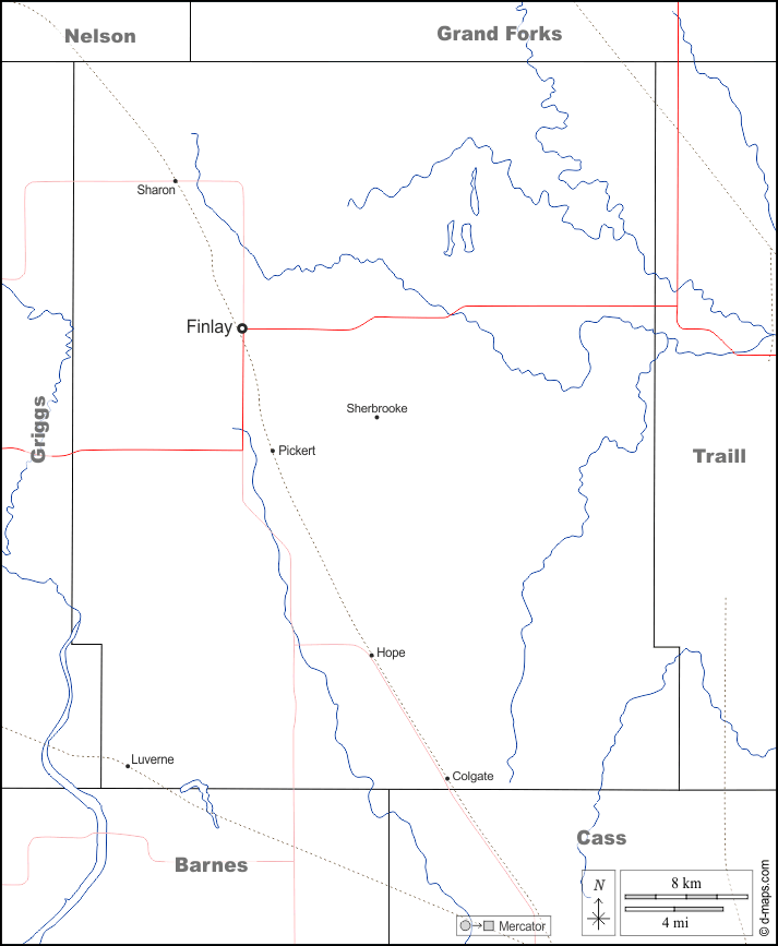 d-maps > संयुक्त राज्य > नॉर्थ डकोटा > स्टील काउंटी > सीमाओं, जल-सर्वेक्षण, मुख्य शहरों, सड़कों, नाम, सफेद