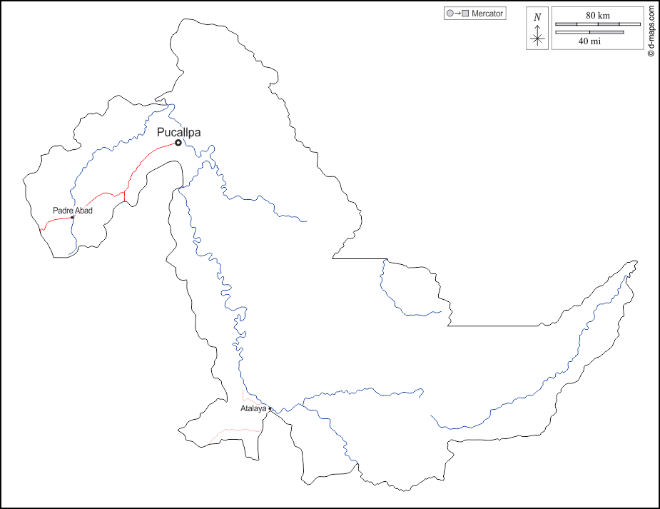 d-maps > महाअमेरिका > पेरू > उकायली > बाह्यरेखा, जल-सर्वेक्षण, मुख्य शहरों, सड़कों, नाम, सफेद