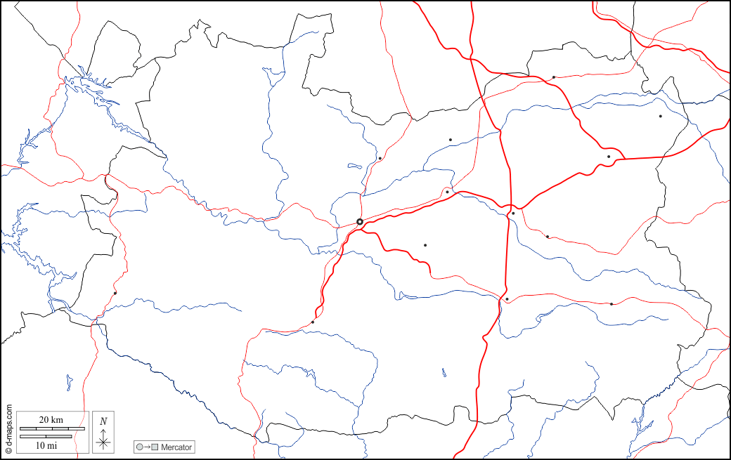 d-maps > यूरोप > स्पेन > सिदाद रीयल > सीमाओं, जल-सर्वेक्षण, मुख्य शहरों, सड़कों, सफेद