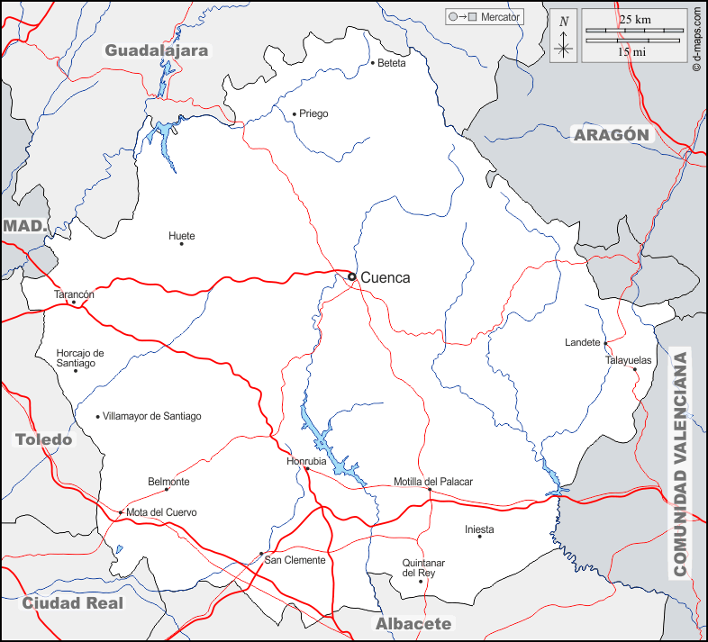 यूरोप > स्पेन > क्वेंका > सीमाओं, जल-सर्वेक्षण, मुख्य शहरों, सड़कों, नाम