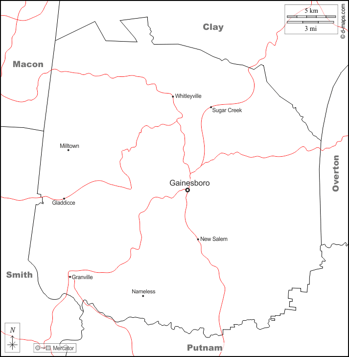 d-maps > संयुक्त राज्य > टेनेसी > जैक्सन काउंटी > सीमाओं, मुख्य शहरों, सड़कों, नाम, सफेद