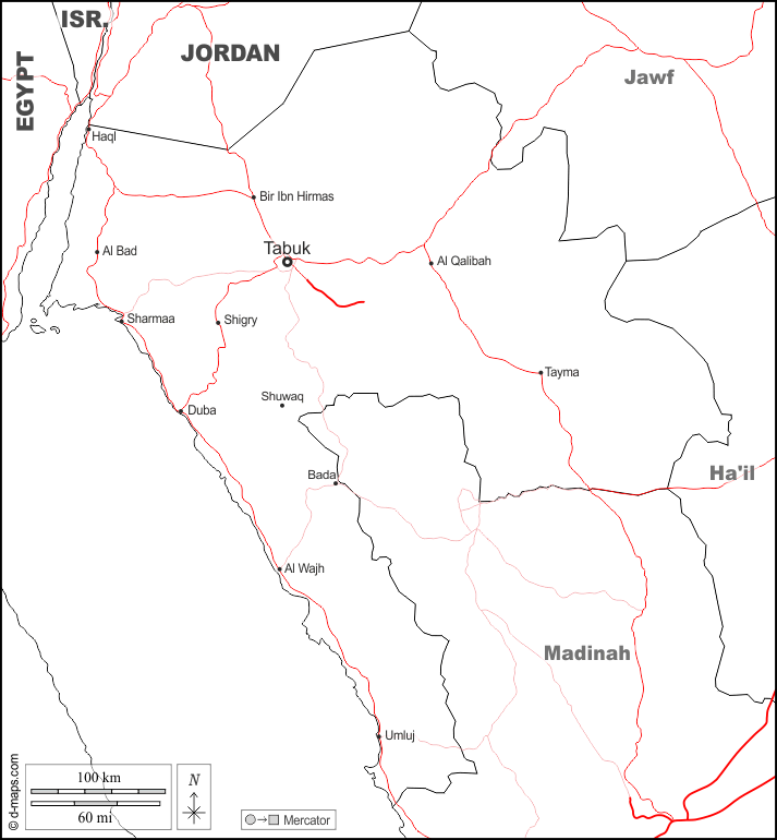 d-maps > एशिया > सऊदी अरब > तबुक प्रांत > सीमाओं, मुख्य शहरों, सड़कों, नाम, सफेद