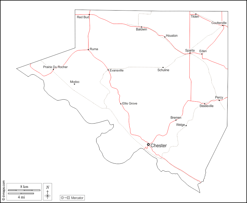d-maps > संयुक्त राज्य > इलिनॉय > रैंडोल्फ़ काउंटी > बाह्यरेखा, मुख्य शहरों, सड़कों, नाम, सफेद