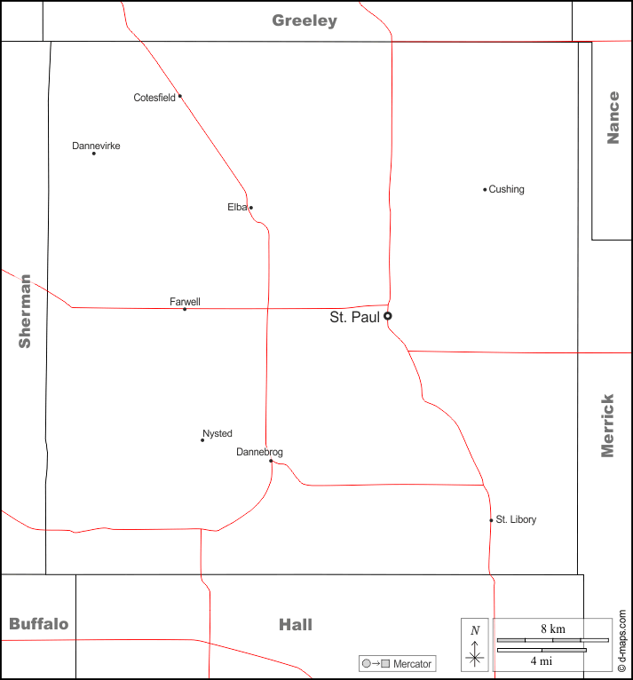 d-maps > संयुक्त राज्य > नेब्रास्का > हॉवर्ड काउंटी > सीमाओं, मुख्य शहरों, सड़कों, नाम, सफेद