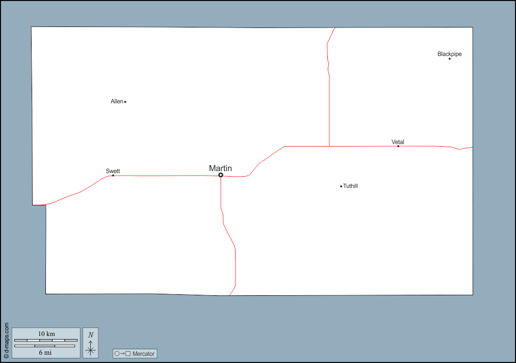 d-maps > संयुक्त राज्य > साउथ डकोटा > बेनेट काउंटी > बाह्यरेखा, मुख्य शहरों, सड़कों, नाम