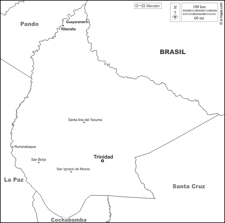 d-maps > महाअमेरिका > बोलीविया > बेनी विभाग > सीमाओं, मुख्य शहरों, नाम, सफेद