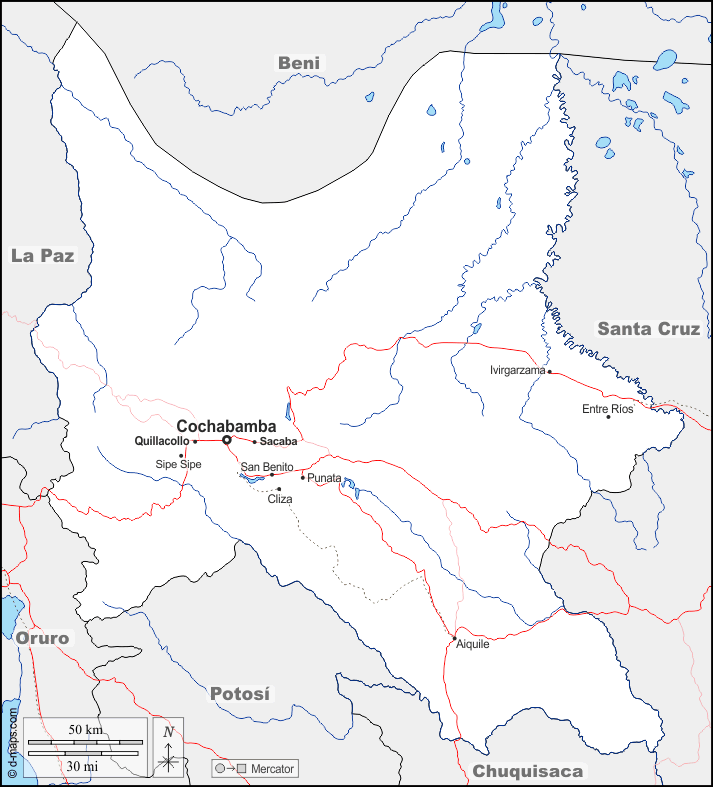 d-maps > महाअमेरिका > बोलीविया > कोचाबम्बा > सीमाओं, जल-सर्वेक्षण, मुख्य शहरों, सड़कों, नाम