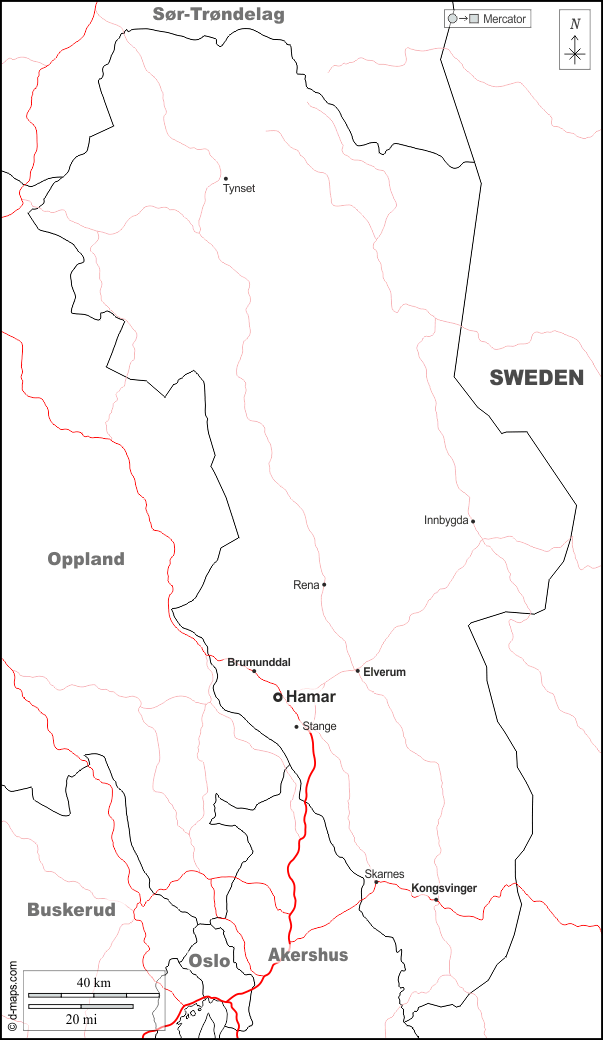 d-maps > यूरोप > नॉर्वे > हेडेमार्क > सीमाओं, मुख्य शहरों, सड़कों, नाम, सफेद