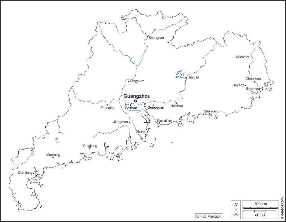 d-maps > एशिया > चीनी जनवादी गणराज्य > गुआंग्डोंग > बाह्यरेखा, जल-सर्वेक्षण, मुख्य शहरों, नाम, सफेद