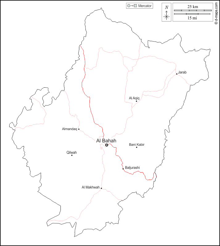 d-maps > एशिया > सऊदी अरब > अल-बहा प्रांत > बाह्यरेखा, मुख्य शहरों, सड़कों, नाम, सफेद