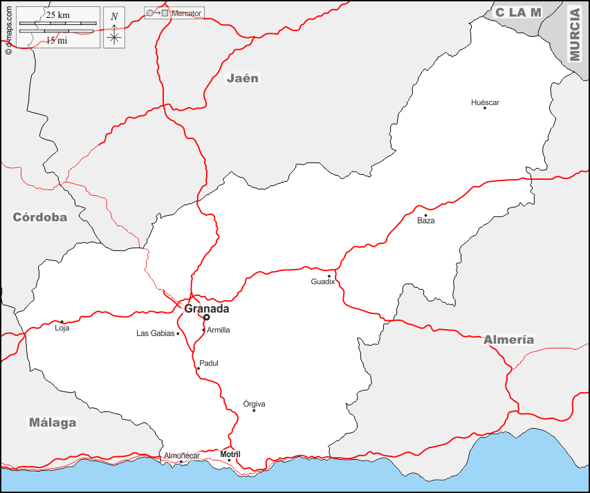 d-maps > यूरोप > स्पेन > ग्रेनेडा > सीमाओं, मुख्य शहरों, सड़कों, नाम