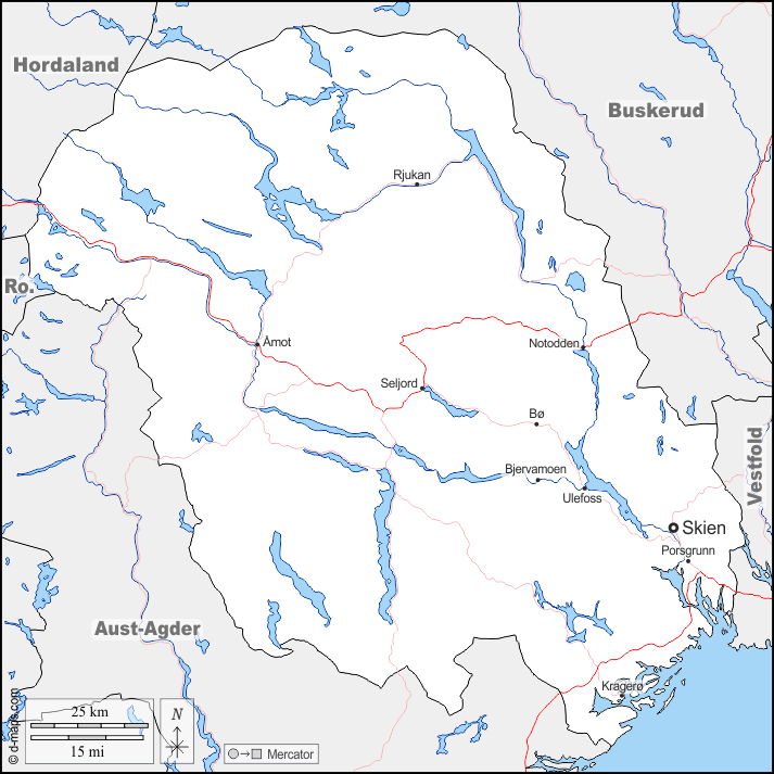 d-maps > यूरोप > नॉर्वे > टेलीमार्क > सीमाओं, जल-सर्वेक्षण, मुख्य शहरों, सड़कों, नाम