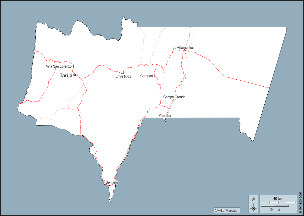 d-maps > महाअमेरिका > बोलीविया > तरीजा > बाह्यरेखा, मुख्य शहरों, सड़कों, नाम