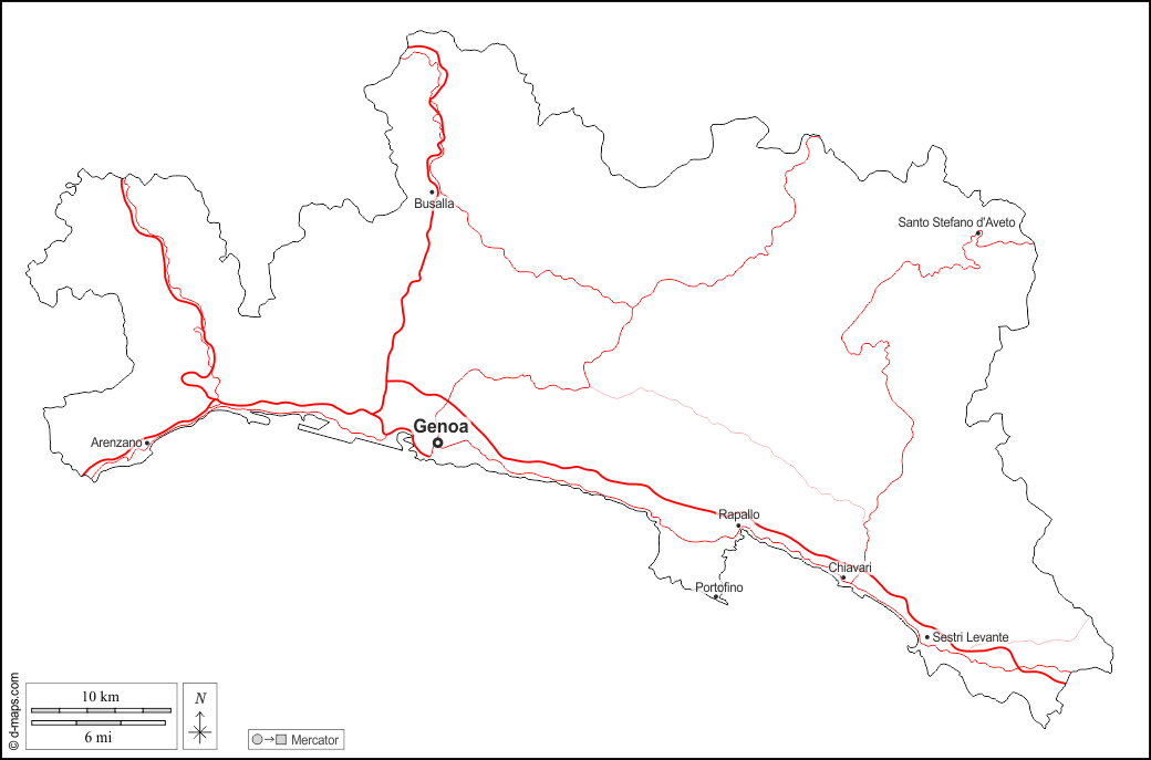 d-maps > यूरोप > इटली > जेनोआ > बाह्यरेखा, मुख्य शहरों, सड़कों, नाम, सफेद