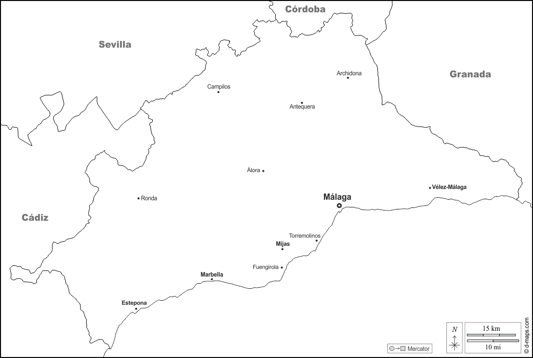 d-maps > यूरोप > स्पेन > मैलेगा > सीमाओं, मुख्य शहरों, नाम, सफेद