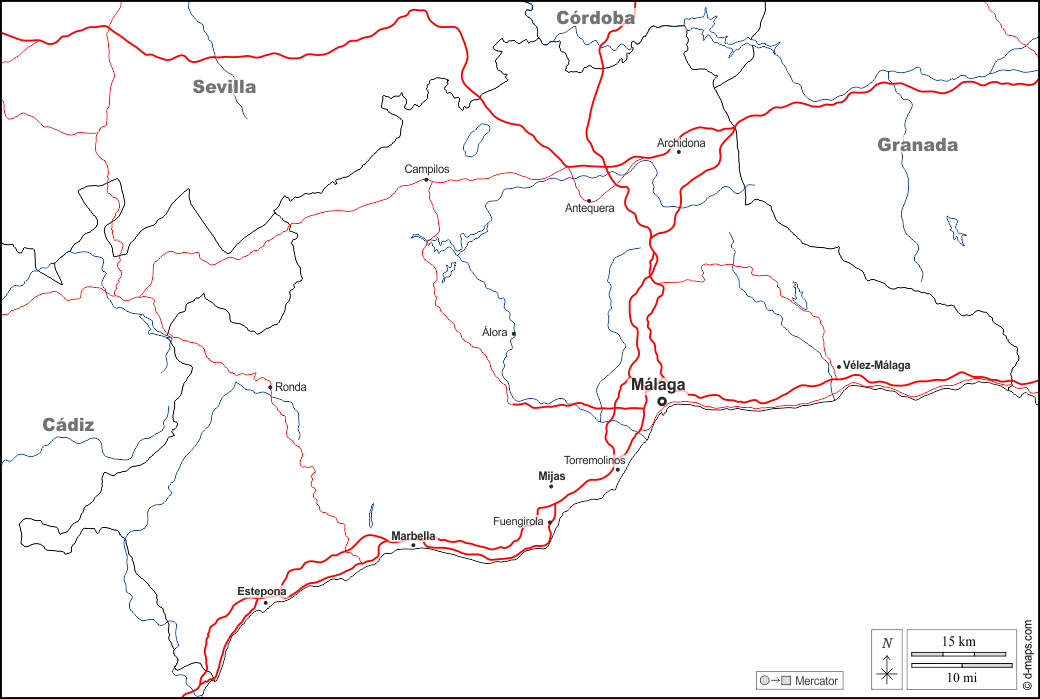 d-maps > यूरोप > स्पेन > मैलेगा > सीमाओं, जल-सर्वेक्षण, मुख्य शहरों, सड़कों, नाम, सफेद