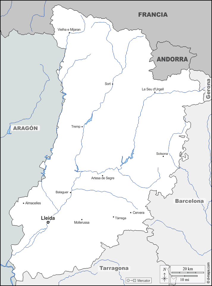 d-maps > यूरोप > स्पेन > पश्चिमी कैटलोनिया > सीमाओं, जल-सर्वेक्षण, मुख्य शहरों, नाम