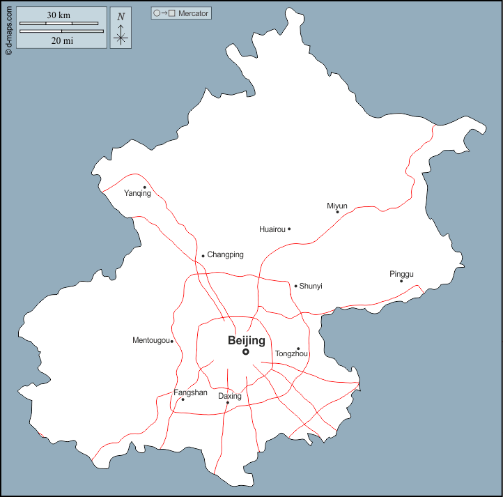 d-maps > एशिया > चीनी जनवादी गणराज्य > बीजिंग > बाह्यरेखा, मुख्य शहरों, सड़कों, नाम