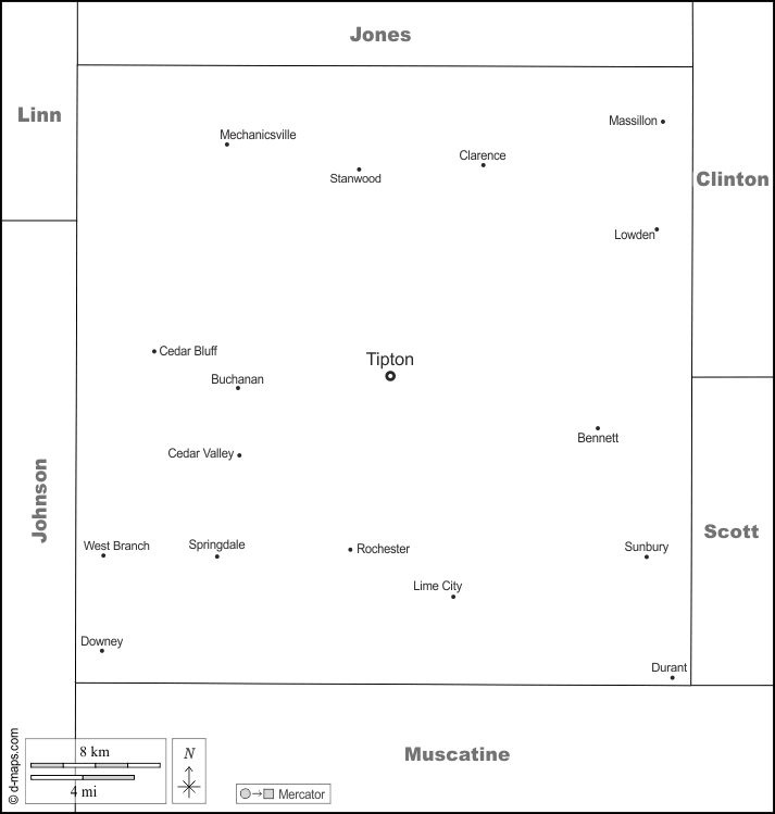 Bennett - Buchanan - Cedar Bluff - Cedar Valley - Clarence - Downey - Durant - Lime City - Lowden - Massillon - Mechanicsville - Rochester - Springdale - Stanwood - Sunbury - Tipton - West Branch