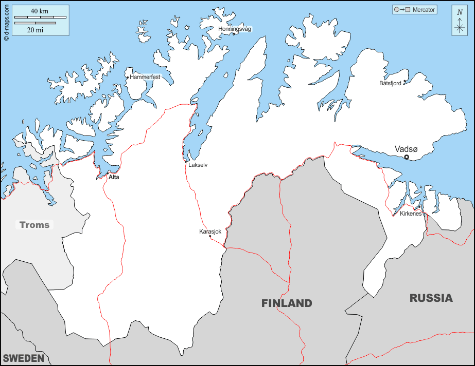 d-maps > यूरोप > नॉर्वे > फ़िनमार्क > सीमाओं, मुख्य शहरों, सड़कों, नाम