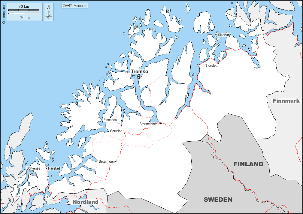 d-maps > यूरोप > नॉर्वे > ट्रोम्स > सीमाओं, मुख्य शहरों, सड़कों, नाम