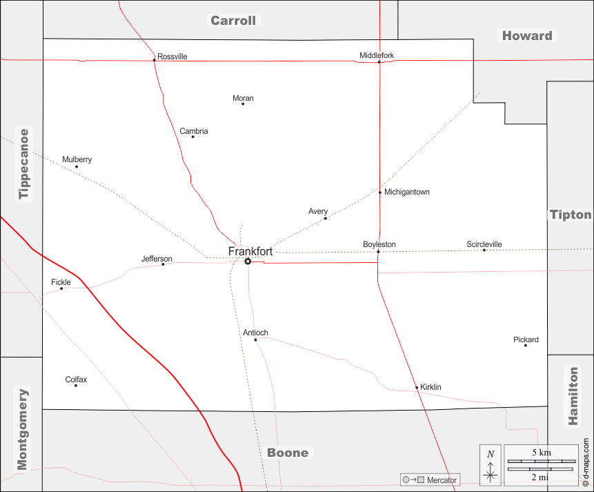 d-maps > संयुक्त राज्य > इंडियाना > क्लिंटन काउंटी > सीमाओं, मुख्य शहरों, सड़कों, नाम