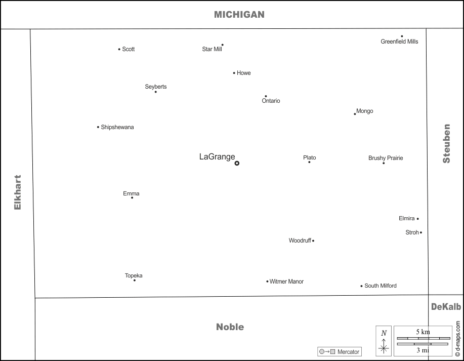 d-maps > संयुक्त राज्य > इंडियाना > लाग्रैंज काउंटी > सीमाओं, मुख्य शहरों, नाम, सफेद