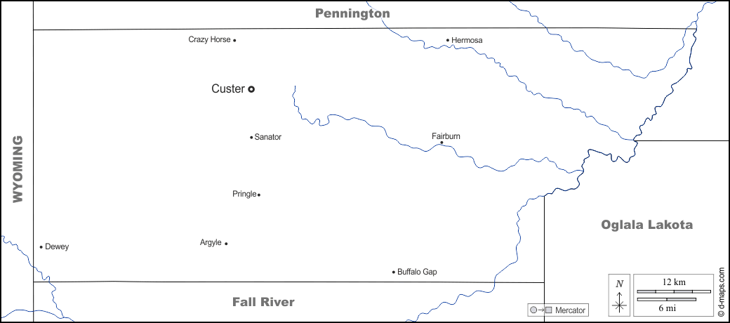 d-maps > संयुक्त राज्य > साउथ डकोटा > कस्टर > सीमाओं, जल-सर्वेक्षण, मुख्य शहरों, नाम, सफेद