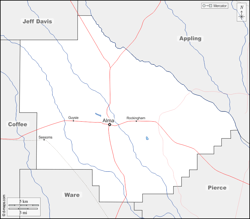 d-maps > संयुक्त राज्य > जॉर्जिया > बेकन > सीमाओं, जल-सर्वेक्षण, मुख्य शहरों, सड़कों, नाम