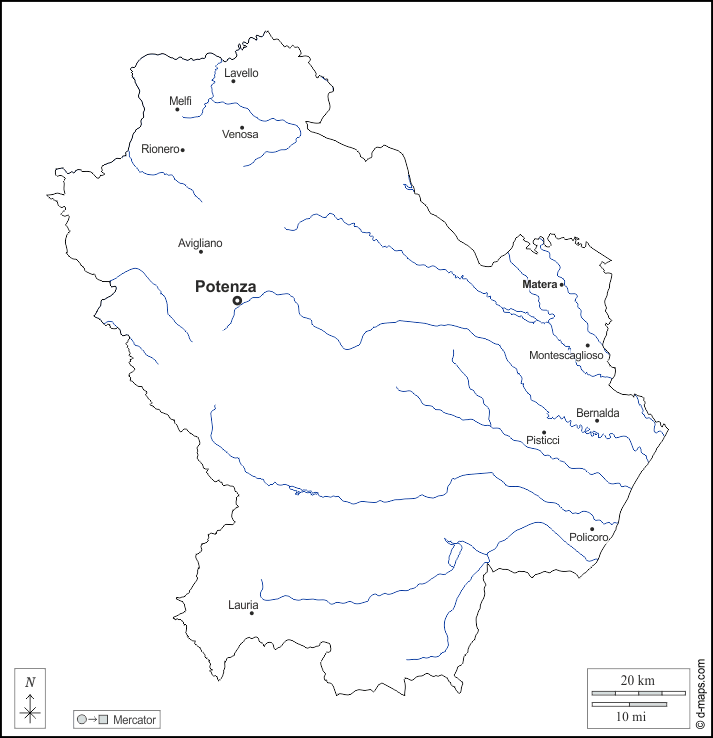 d-maps > यूरोप > इटली > बाज़िलीकाता > बाह्यरेखा, जल-सर्वेक्षण, मुख्य शहरों, नाम, सफेद