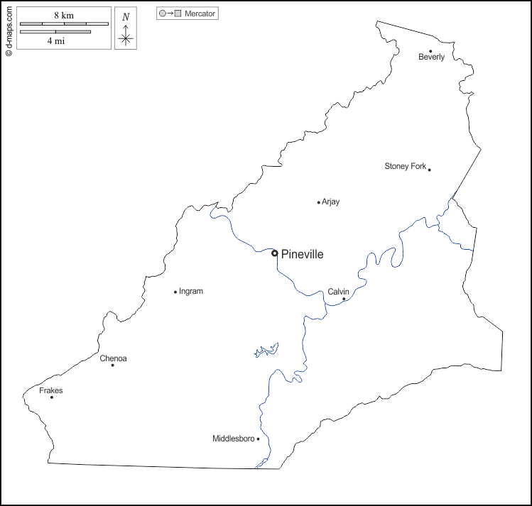 d-maps > संयुक्त राज्य > केंटुकी > बेल > बाह्यरेखा, जल-सर्वेक्षण, मुख्य शहरों, नाम, सफेद
