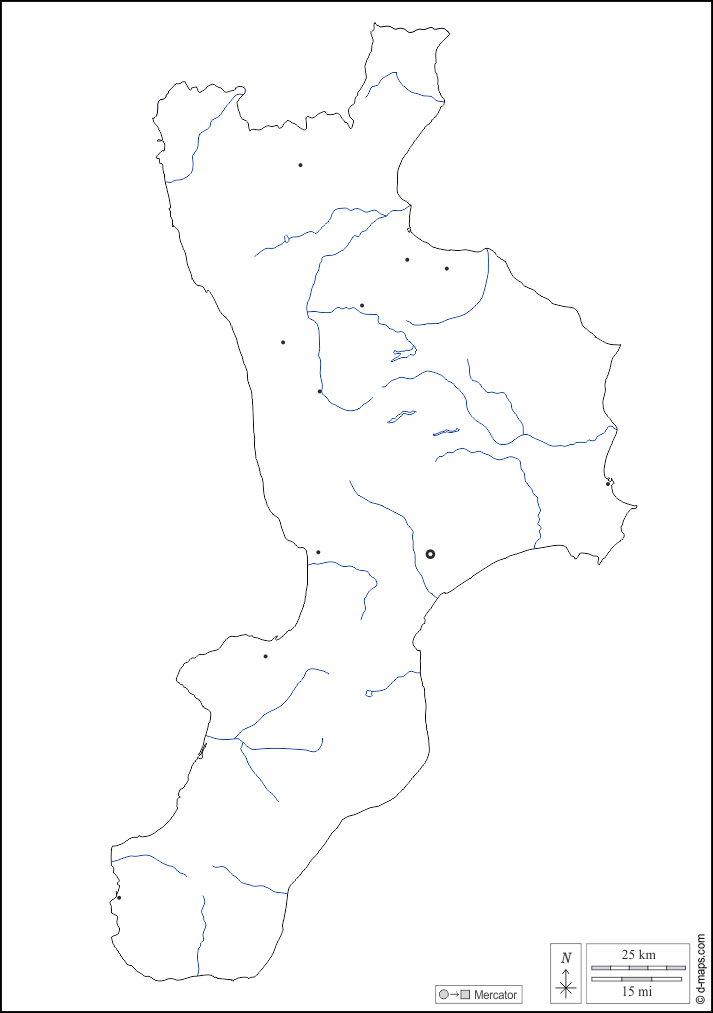 d-maps > यूरोप > इटली > कालाब्रिया > बाह्यरेखा, जल-सर्वेक्षण, मुख्य शहरों, सफेद