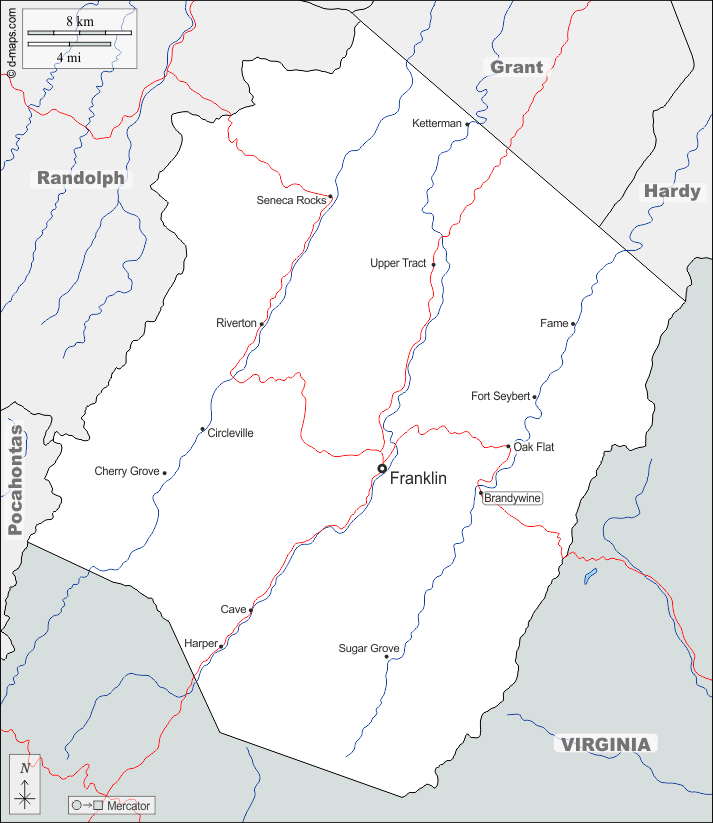 d-maps > संयुक्त राज्य > वेस्ट वर्जीनिया > पेंडलटन > सीमाओं, जल-सर्वेक्षण, मुख्य शहरों, सड़कों, नाम