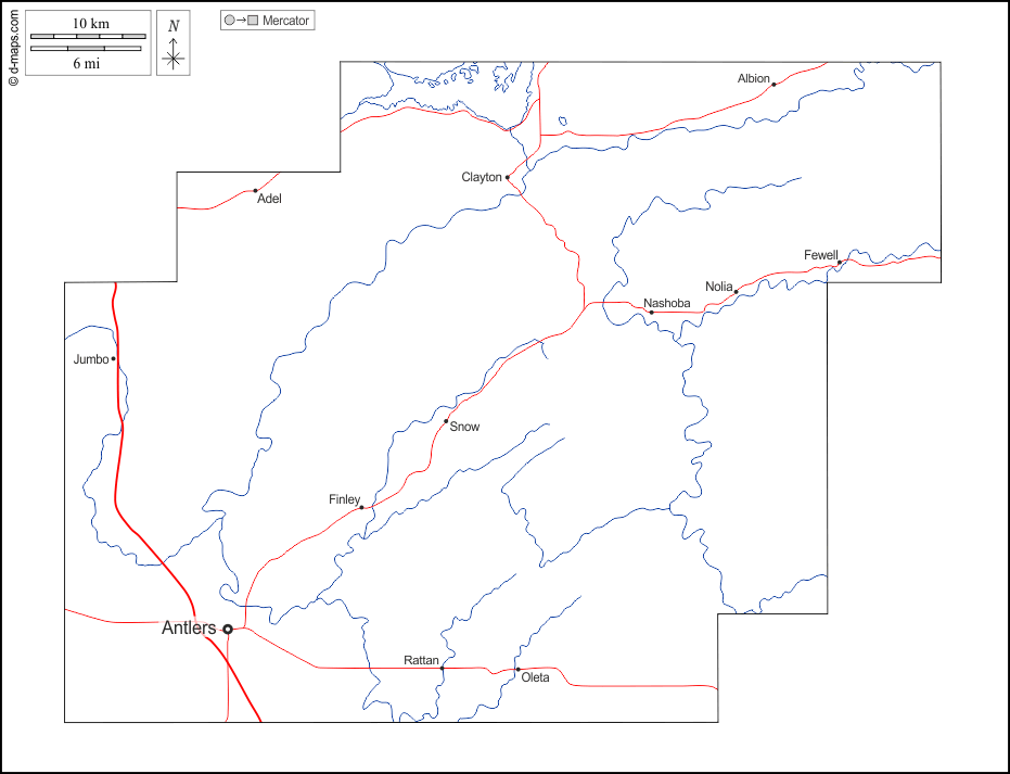 d-maps > संयुक्त राज्य > ओकलाहोमा > पुषमताहा > बाह्यरेखा, जल-सर्वेक्षण, मुख्य शहरों, सड़कों, नाम, सफेद