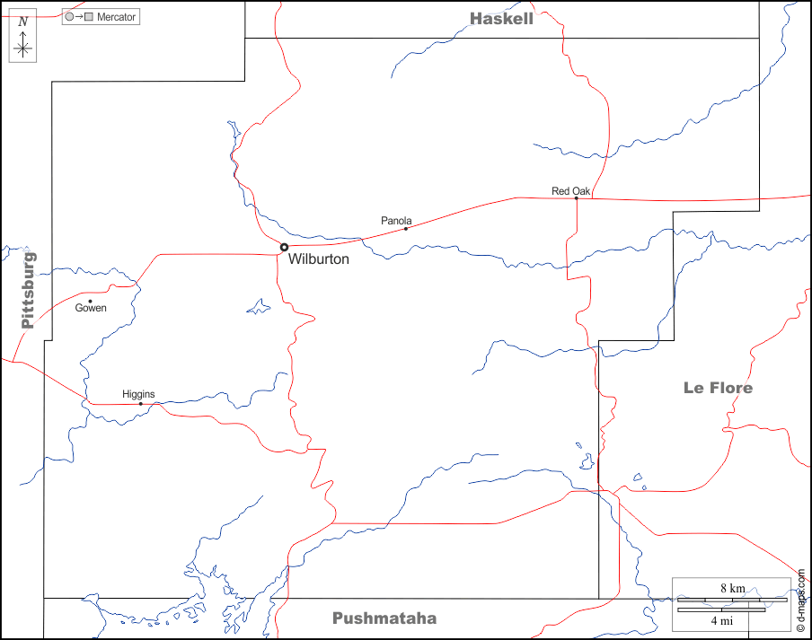 d-maps > संयुक्त राज्य > ओकलाहोमा > ओक्लाहोमा पूर्व > सीमाओं, जल-सर्वेक्षण, मुख्य शहरों, सड़कों, नाम, सफेद