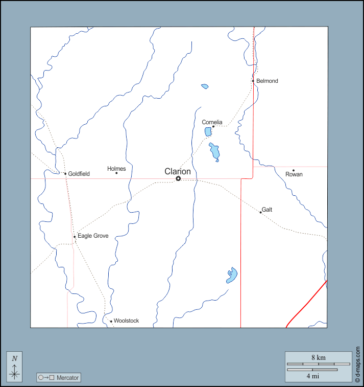 d-maps > संयुक्त राज्य > आयोवा > राइट > बाह्यरेखा, जल-सर्वेक्षण, मुख्य शहरों, सड़कों, नाम
