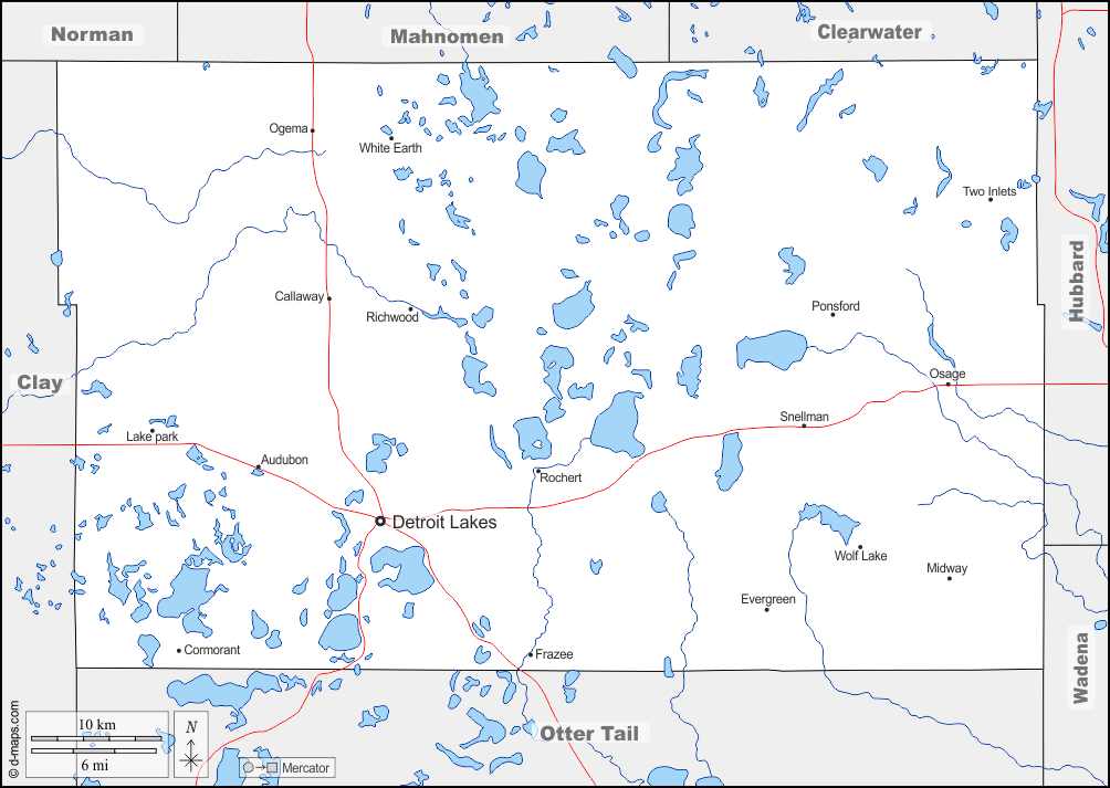 d-maps > संयुक्त राज्य > मिनेसोटा > बेकर > सीमाओं, जल-सर्वेक्षण, मुख्य शहरों, सड़कों, नाम