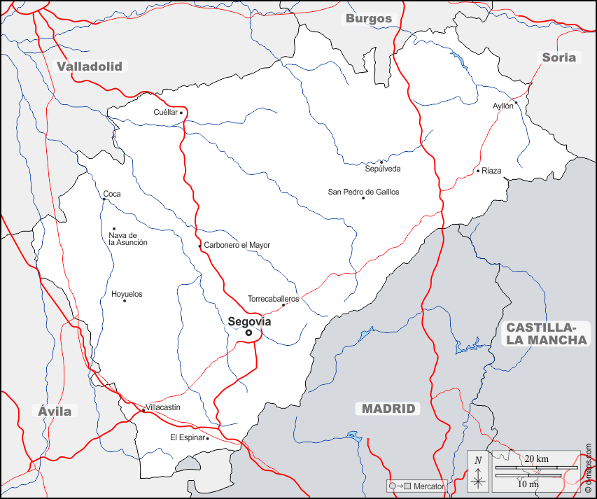d-maps > यूरोप > स्पेन > सेगोविआ > सीमाओं, जल-सर्वेक्षण, मुख्य शहरों, सड़कों, नाम