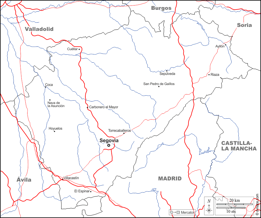 d-maps > यूरोप > स्पेन > सेगोविआ > सीमाओं, जल-सर्वेक्षण, मुख्य शहरों, सड़कों, नाम, सफेद