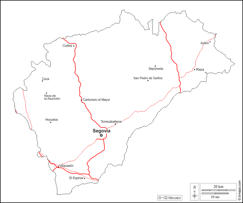 d-maps > यूरोप > स्पेन > सेगोविआ > बाह्यरेखा, मुख्य शहरों, सड़कों, नाम, सफेद