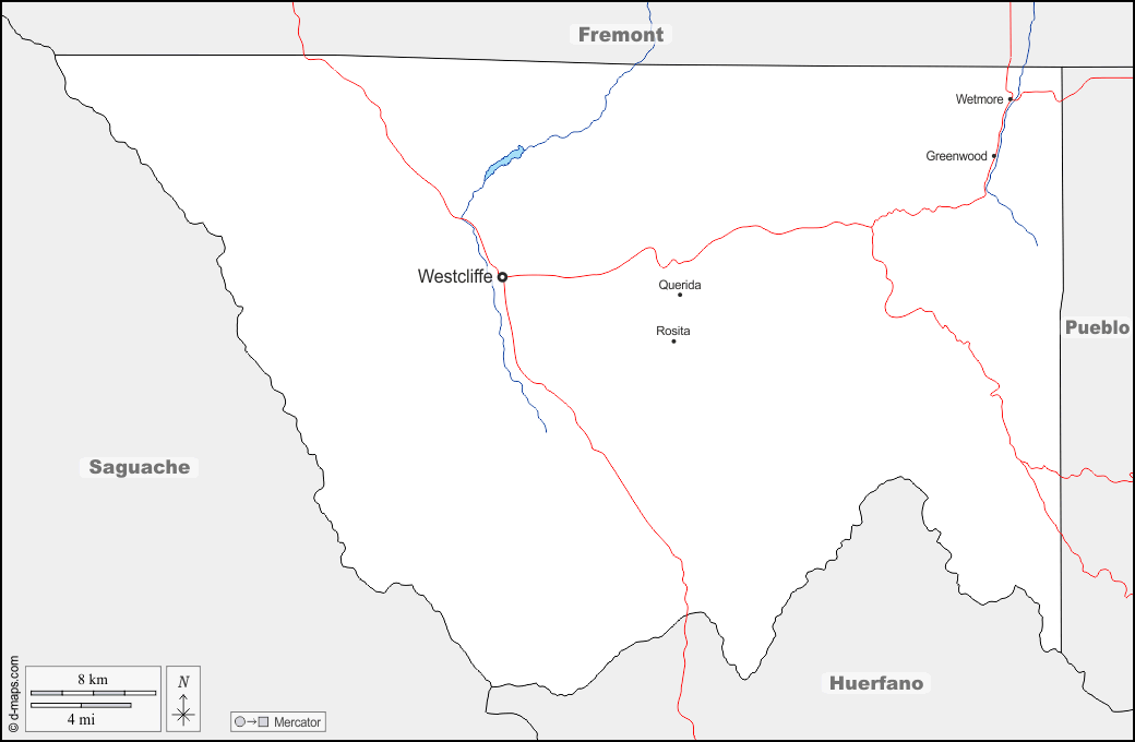 d-maps > संयुक्त राज्य > कोलोराडो > कस्टर > सीमाओं, जल-सर्वेक्षण, मुख्य शहरों, सड़कों, नाम