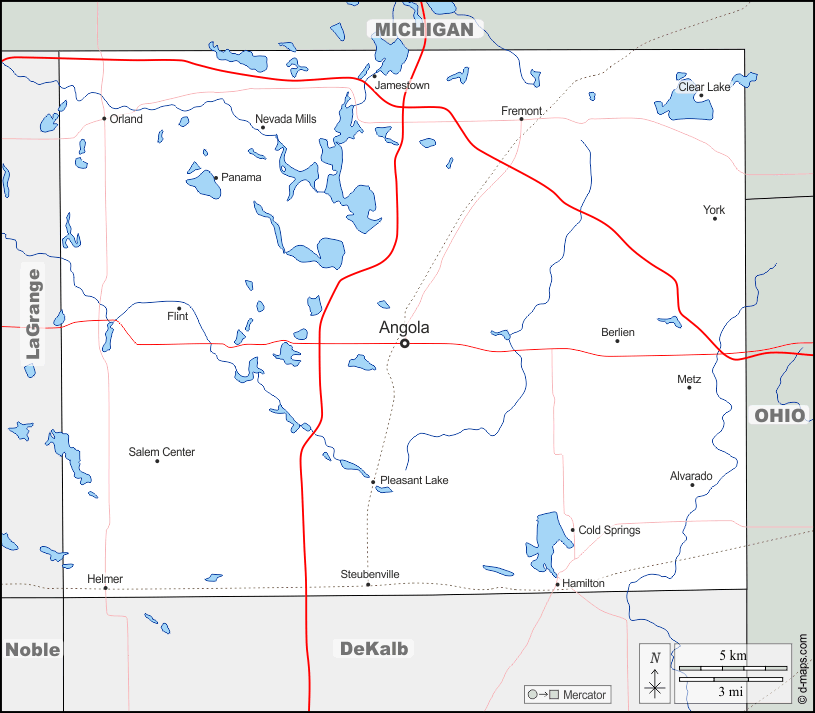 d-maps > संयुक्त राज्य > इंडियाना > इंडियाना नॉर्थ ईस्ट > सीमाओं, जल-सर्वेक्षण, मुख्य शहरों, सड़कों, नाम