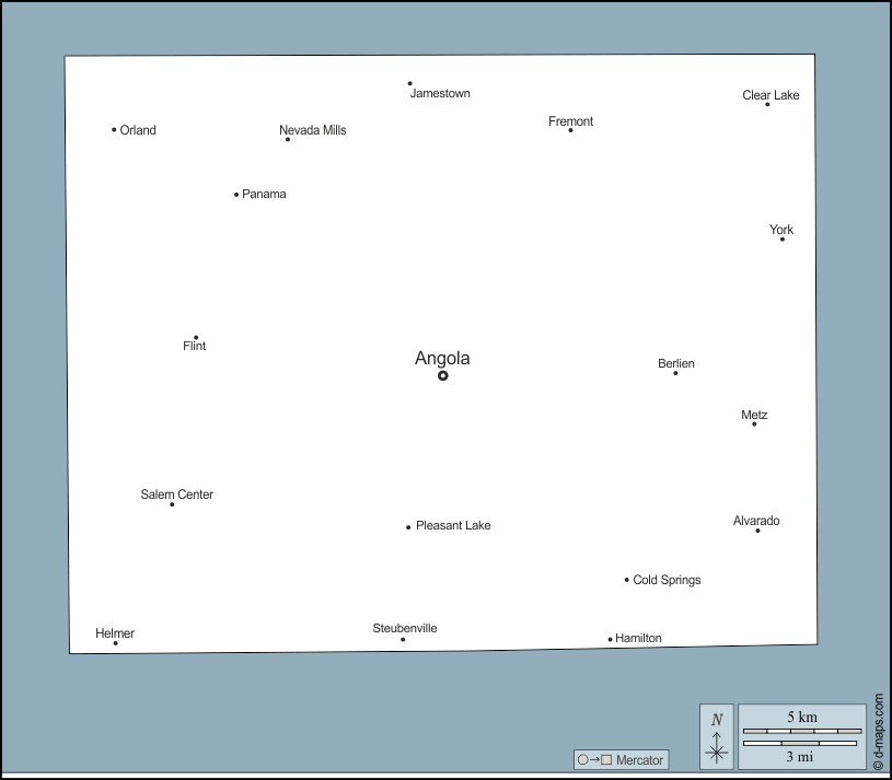 Alvarado - Angola - Berlien - Clear Lake - Cold Springs - Flint - Fremont - Hamilton - Helmer - Jamestown - Metz - Nevada Mills - Orland - Panama - Pleasant Lake - Salem Center - Steubenville - York
