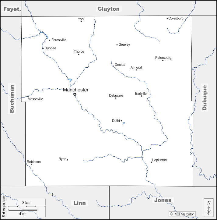 d-maps > संयुक्त राज्य > आयोवा > डेलावेयर > सीमाओं, जल-सर्वेक्षण, मुख्य शहरों, नाम