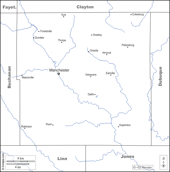 d-maps > संयुक्त राज्य > आयोवा > डेलावेयर > सीमाओं, जल-सर्वेक्षण, मुख्य शहरों, नाम, सफेद