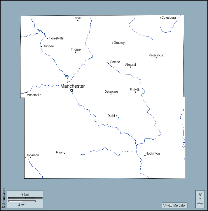 d-maps > संयुक्त राज्य > आयोवा > डेलावेयर > बाह्यरेखा, जल-सर्वेक्षण, मुख्य शहरों, नाम