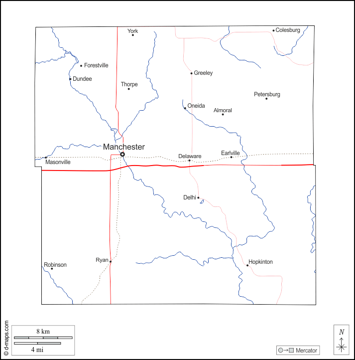 d-maps > संयुक्त राज्य > आयोवा > डेलावेयर > बाह्यरेखा, जल-सर्वेक्षण, मुख्य शहरों, सड़कों, नाम, सफेद
