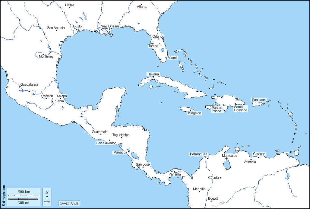 d-maps > महाअमेरिका > मध्य अमेरिका > तटों, जल-सर्वेक्षण, मुख्य शहरों, नाम